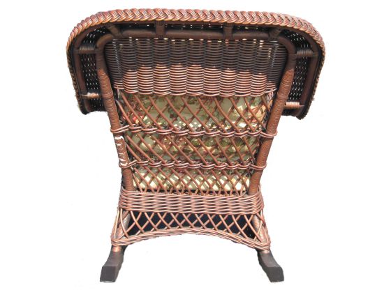 Leave the hustle and bustle of a busy workday behind and settle into the Bar Harbor wicker rocker. Natural rattan fibers turn it into an heirloom piece with braided accents as trim to highlight open gridding and closed weaving. Wide flat arms span upward to provide a generously sized back with full support. The seat’s decking with sturdy strapping provides even more comfort for lingering. Wicker construction pairs with wood rails in a matched choice of finishes that give it an antiqued edge. Fabric selections for seat and back cushions range from vintage and neutral patterns to brights and tropicals.