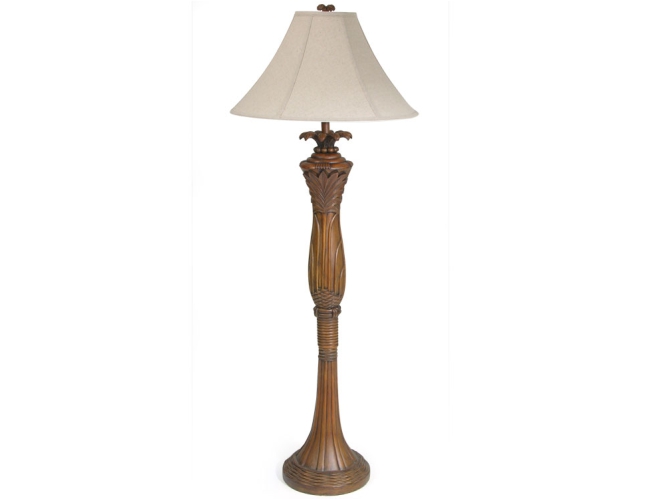 Inspired by the spirit of a popular French-Polynesian island, the Moorea floor lamp is a beauty with its tropical floral theme. The resin stand is shapely and features raised relief, hand-painted detailing. Stylized fronds and stems are accompanied by a faux wicker pattern highlighted with a two-tone burnishing that casts a lustrous glow even in natural light. A flared bell shade in textured fabric with hard backing is a complementing topper. In a reading corner or integrated into a living room grouping, the Moorea floor lamp can also pair with matching table models for larger spaces.