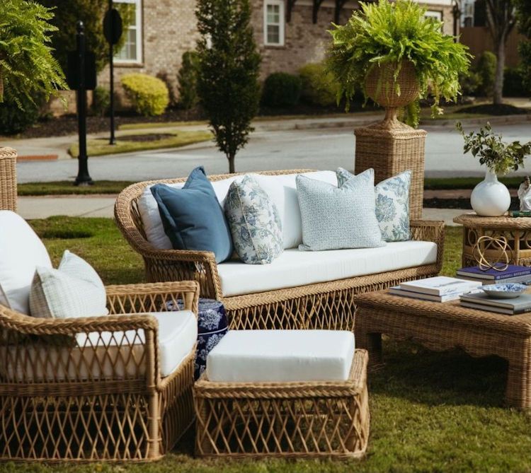 Add the Rosemary Outdoor Sofa to your collection of fine terrace or porch furnishings. This sofa has a classic look and feel with its handcrafted polyresin wicker on a sturdy aluminum frame. The natural finish will blend into the surrounding landscape seamlessly. The rounded back sweeps down into side armrests that will envelope you whether napping or conversing with friends. The base features a cross hatch pattern that is open and airy. Fill the deep seat and gently angled back with soft cushions covered in weather-resistant Sunbrella fabric, The fabric is available in eleven colors or patterns that take inspiration from the seaside. You are going to love lounging on this Rosemary Outdoor Wicker Sofa on a warm weekend late afternoon while sipping sweet tea or a glass of rose.